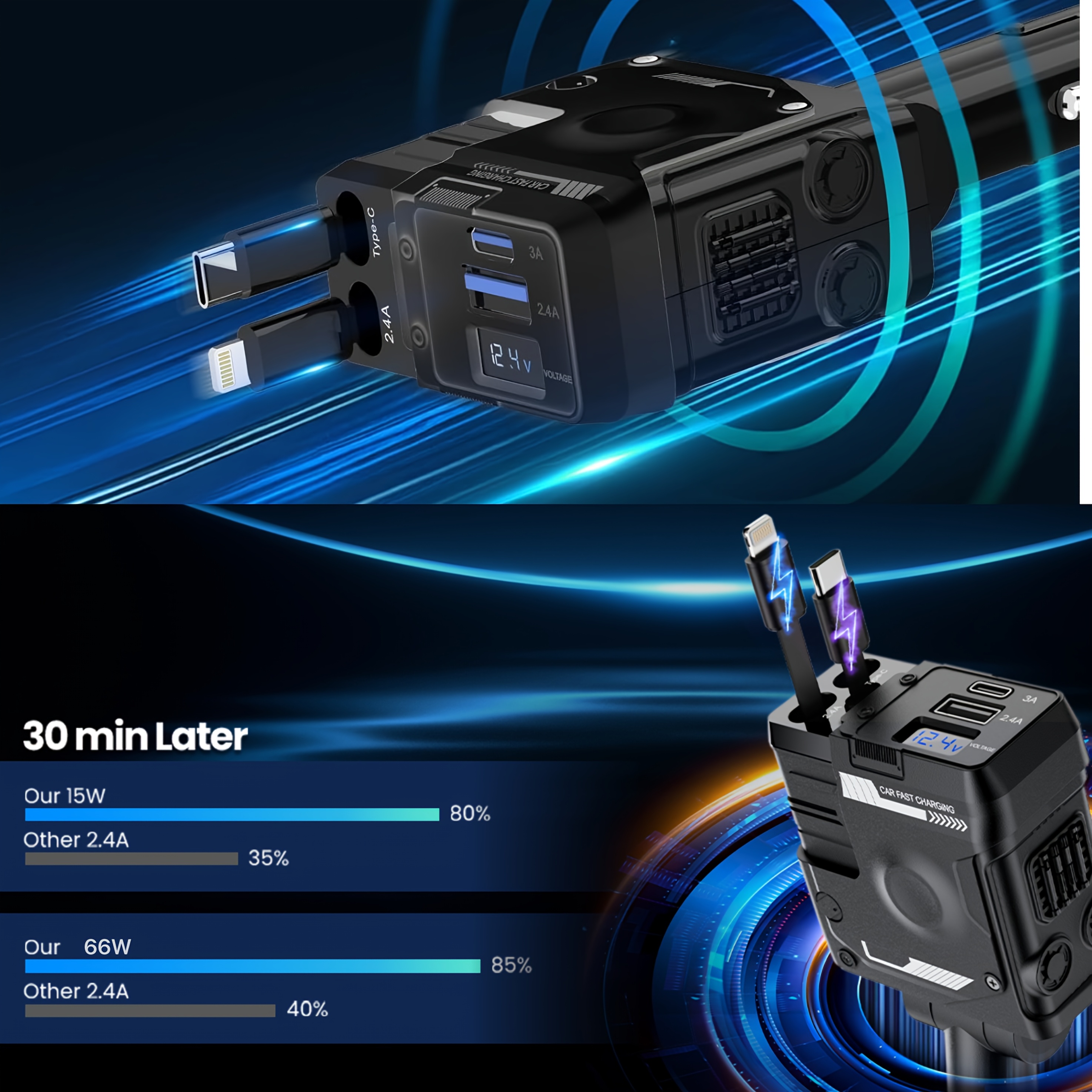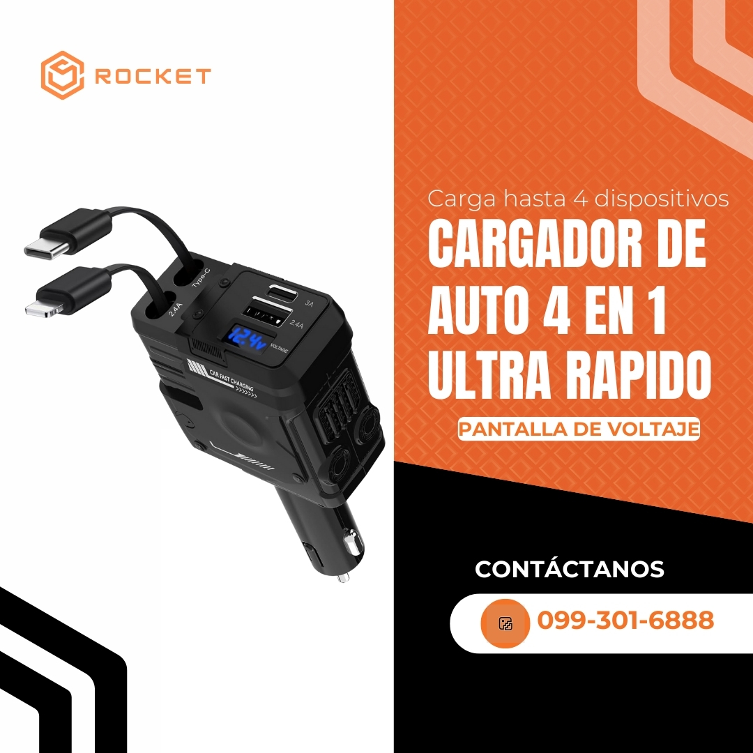 CARGADOR DE AUTO 4 EN 1 ULTRA RAPIDO Mantén todos tus dispositivos cargados y tu tablero siempre ordenado con la solución definitiva para viajes. Este AUTO 4 EN 1 ULTRA RAPIDOcargador de alto rendimiento combina potencia, versatilidad y un diseño retráctil que elimina el desorden de cables en tu vehículo.