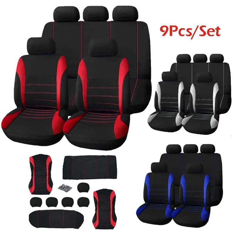Compuesto de 9 piezas que se adaptan a la mayoría de tipos de asientos de coches. Incluye cinco reposacabezas, dos fundas integrales para los asientos delanteros, y dos fundas para los asientos traseros. Los asientos traseros disponen de funda para el asiento y funda para el respaldo.